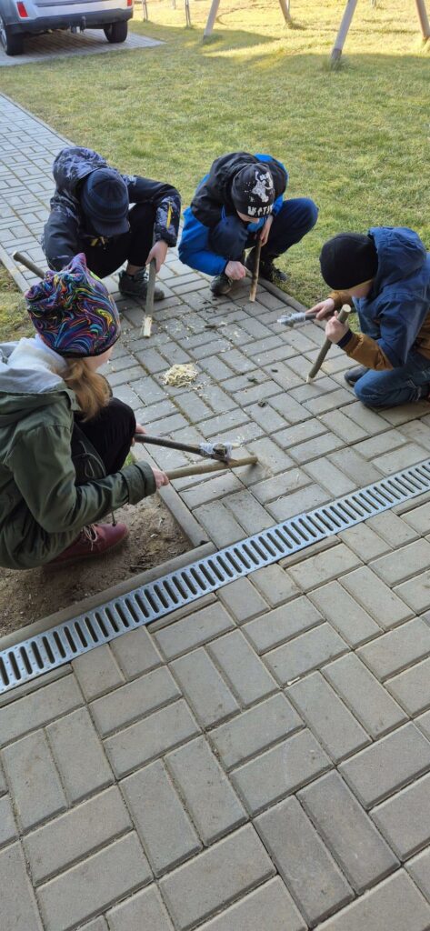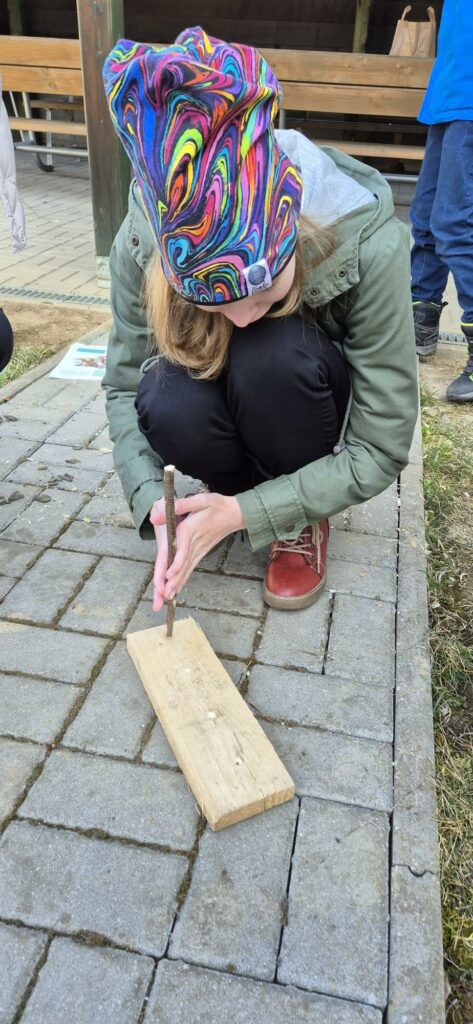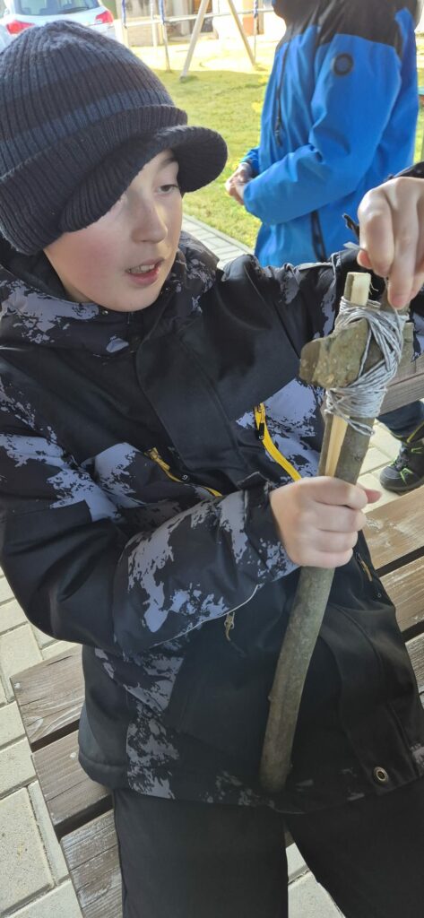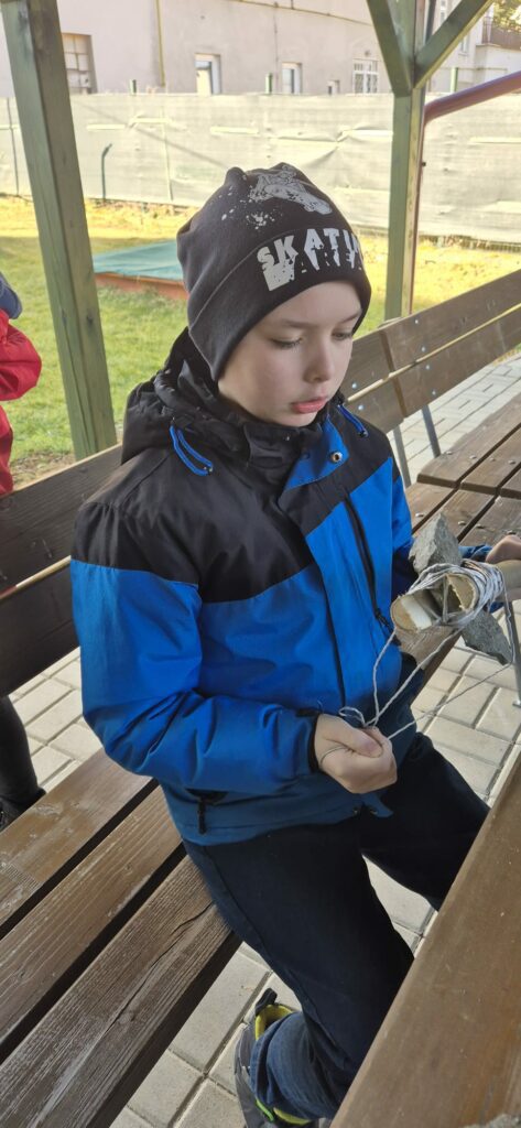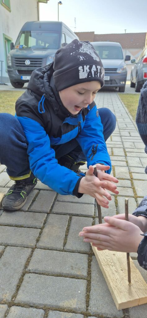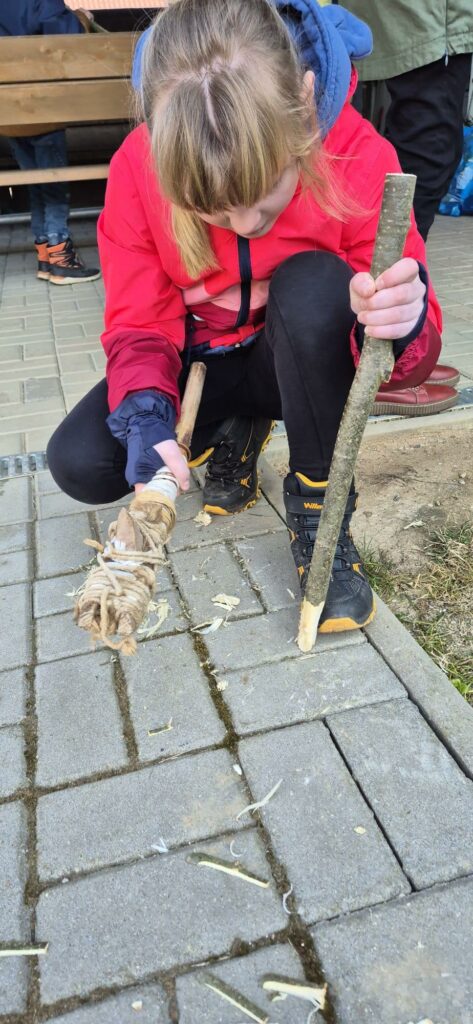 Žáci si vyzkoušeli vyrobit kamennou sekeru, pazourkem udělat dřevěný oštěp a na závěr se učili křesat.